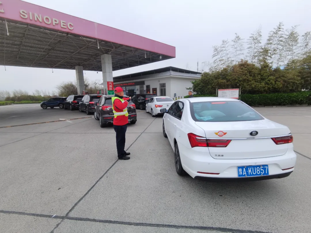 4月5日,鄭州南服務區加油站工作人員引導進站車輛有序加油